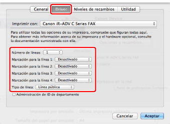 Si está usando Mac OS X 10.7 o anterior, compruebe que el controlador correspondiente al fax que esté usando esté seleccionado en [Usar]. Consulte el nombre del controlador correspondiente a su fax en el archivo Léame.