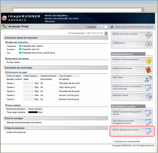 Haga clic en [Service Management Service] en la página del portal de IU remota.
