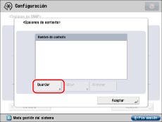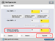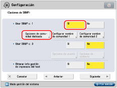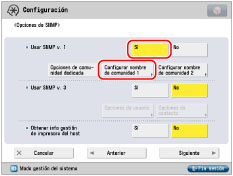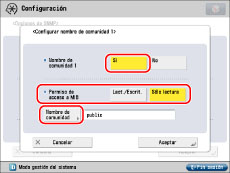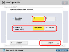 Pulse [Sí] para <Usar SNMP v. 1> → [Opciones de comunidad dedicada]. Pulse [Sí] para <Comunidad dedicada> → [Lect./Escrit.] para <Permiso de acceso a MIB>.