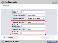 Seleccione [DES] o [AES] de la lista desplegable <Algoritmo de cifrado> → active [Contraseña de cifrado].