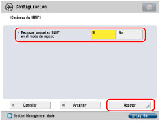 Si activa [Rechazar paquetes SNMP en el modo de reposo], es posible que no pueda acceder al equipo desde software de Canon (Serie iW) o aplicaciones que utilicen el protocolo SNMP.