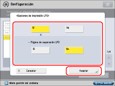 La opción de impresión de una página de presentación de trabajo se establece para cada trabajo de impresión. Incluso aunque [Sí] se haya seleccionado para <Página de separación LPD>, no es posible imprimir la página de separación para un trabajo de impresión a menos que se haya establecido una.