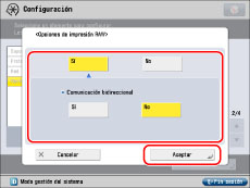 Pulse [Sí] para usar la IU remota, la impresión IPP, la impresión WSD. la lectura WSD, y la confirmación del PIN de gestión de ID de departamentos.