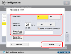 Pulse [Opciones de SNTP] para [Opciones de TCP/IP] → especifique las siguientes opciones → pulse [Aceptar].