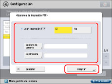 Pulse [Opciones de impresión FTP] para [Opciones de TCP/IP] → especifique las siguientes opciones → pulse [Aceptar].