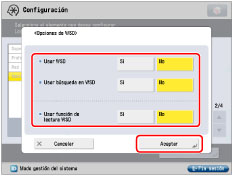 <Usar búsqueda en WSD> se establece automáticamente en 'Sí' si selecciona [Sí] para <Usar WSD> y permite obtener la información acerca del equipo mediante WSD.