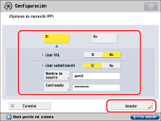 Si desea utilizar la función de autenticación IPP, pulse [Sí] para <Usar autenticación>. Pulse [Nombre de usuario] → introduzca el nombre de usuario que se utilizará para la autenticación IPP → pulse [Aceptar]. Pulse [Contraseña] → introduzca la contraseña que se utilizará para la autenticación IPP → pulse [Aceptar]. En la pantalla de confirmación, escriba la misma contraseña para confirmarla → pulse [Aceptar].