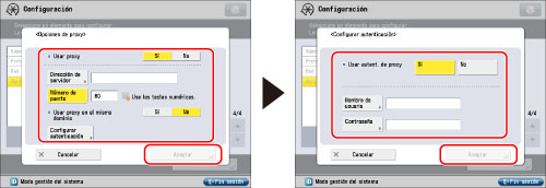 Si desea utilizar la autenticación de proxy, pulse [Configurar autenticación] → pulse [Sí] para <Usar autent. de proxy>. Pulse [Nombre de usuario] → introduzca el nombre de usuario que se utilizará para la autenticación de proxy → pulse [Aceptar]. Pulse [Contraseña] → introduzca la contraseña que se utilizará para la autenticación de proxy → pulse [Aceptar]. En la pantalla de confirmación, escriba la misma contraseña para confirmarla → pulse [Aceptar].