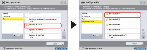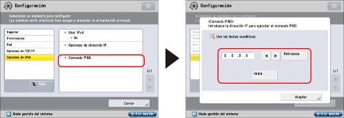 Pulse [Comando PING] para [Opciones de IPv4] → introduzca una dirección IPv4 que exista en la red → pulse [Inicio].