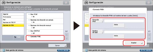 Para verificar una dirección IPv6: Pulse [Dirección IPv6] → introduzca una dirección IPv6 que exista en la red → pulse [Inicio]. Pulse [Aceptar] cuando el resultado de la ejecución del comando PING aparezca en la pantalla táctil.