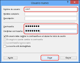 En el cuadro de diálogo [Usuario nuevo], introduzca el nombre de usuario en [Nombre de usuario] → introduzca la contraseña en [Contraseña] → vuelva a introducir la contraseña en [Confirmar contraseña] → haga clic en [Crear].