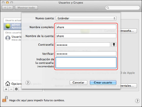 En la ventana [Cuentas]/[Usuarios y Grupos], introduzca el nombre del usuario al que desee enviar datos desde el equipo a través de Mac OS X → introduzca la contraseña.