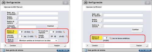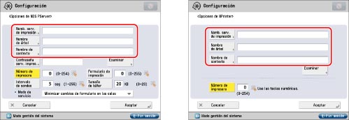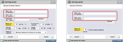 En [Nomb. servidor archivos], introduzca el nombre del servidor de archivos al que pertenece el servidor de impresión deseado → en [Nomb. serv. de impresión], introduzca el nombre del servidor de impresión deseado.