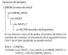 En [Nombre de árbol], introduzca el nombre del árbol al que pertenece el servidor de impresión deseado → en [Nombre de contexto], introduzca el nombre del contexto al que pertenece el servidor de impresión en cuestión → en [Nomb. serv. de impresión], introduzca el nombre de dicho servidor de impresión.