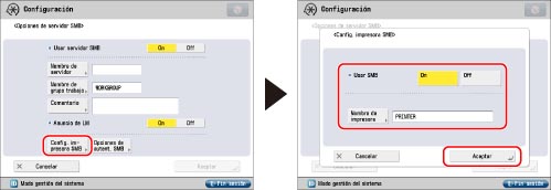 Pulse [Config. impresora SMB] → especifique las opciones de la impresora SMB → pulse [Aceptar].
