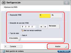 Si desea utilizar la resolución de nombres WINS, pulse [Sí] para <Resolución WINS>. Introduzca la dirección IP de un servidor WINS en [Dirección de servidor WINS].