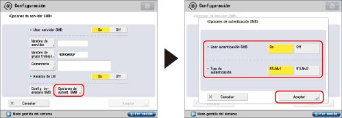 Pulse [Opciones de autent. SMB] → especifique las opciones de autenticación SMB → pulse [Aceptar].
