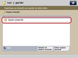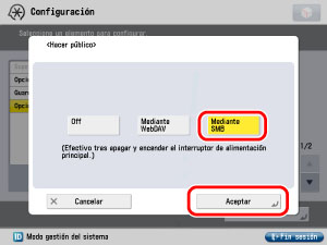 → [Opciones de funciones] → [Guardar/Acceder a archivos] → [Opciones de espacio avanzado] → [Hacer público] → [Mediante SMB] → [Aceptar].