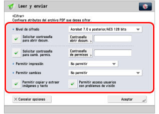 Puede cifrar archivos PDF estableciendo una contraseña. Solamente los usuarios que introduzcan la contraseña correcta podrán abrir, imprimir o cambiar el archivo PDF. Para utilizar esta función se requiere el Set de Seguridad.