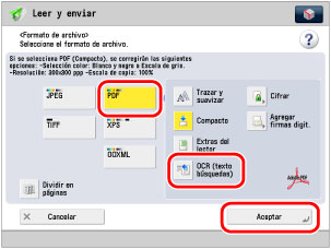 Seleccione [PDF] → [OCR (texto búsquedas)] → [Aceptar].