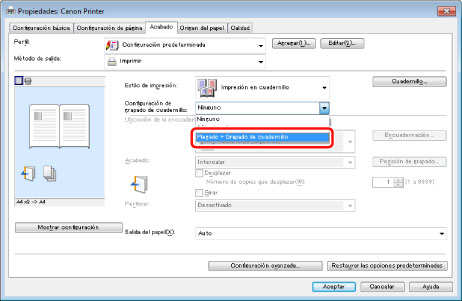 Seleccione [Plegado + Grapado de cuadernillo] desde la lista desplegable [Configuración de grapado de cuadernillo] → haga clic en [Aceptar] → [Aceptar].