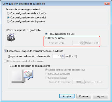 En el cuadro de diálogo [Configuración detallada de cuadernillo] que aparece cuando hace clic en [Cuadernillo], puede especificar la configuración para el cuadernillo, como por ejemplo el diseño.