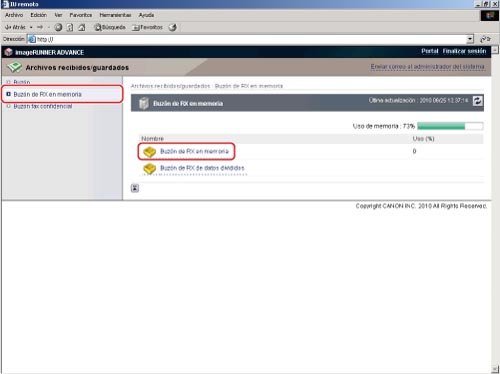 Haga clic en [Archivos recibidos/guardados] → [Buzón de RX en memoria] → [Buzón de RX en memoria].