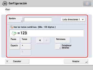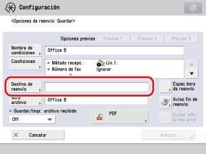 Pulse [Destino de reenvío] → en la libreta de direcciones, seleccione el número de fax de la oficina B que guardó en el paso 2 → pulse [Aceptar].