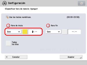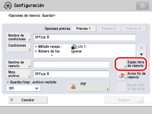 Pulse [Espec.hora de reenvío] → especifique la hora y el día en que se cumplirá la condición de reenvío.