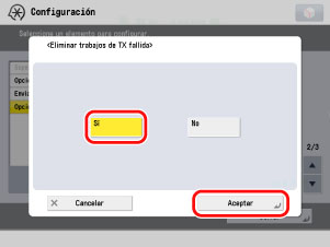 → [Opciones de funciones] → [Recepción/Reenvío] → [Opciones comunes] → [Eliminar trabajos de TX fallida].