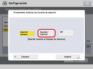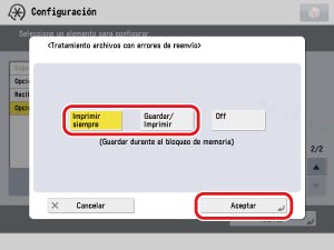 → [Opciones de funciones] → [Recepción/Reenvío] → [Opciones comunes] → [Tratamiento archivos con errores de reenvío] → seleccione [Guardar/Imprimir] → pulse [Aceptar].