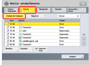 Se muestra el estado de enviar todos los trabajos (fax, fax por Internet, transmisión de archivos, e-mail, y reenvío), y aparece <Error> para errores de reenvío de la misma forma que otros errores de transmisión.