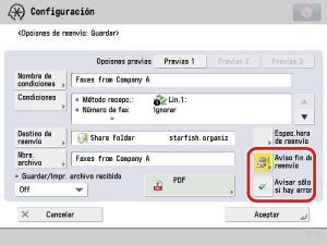 Puede establecer el enviar notificación vía e-mail cuando ocurran un errores de reenvío. Seleccione una condición de reenvío → pulse [Detalles/Editar] → seleccione [Aviso fin de reenvío] y [Avisar sólo si hay error].
