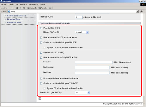 Si el servidor SMTP no admite cifrado, los datos no se cifrarán incluso aunque seleccione 'Sí' para <Permitir SSL (TX SMTP)>.