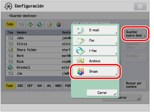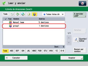 Seleccione el destino recién guardado [grupo1] → pulse [Aceptar].