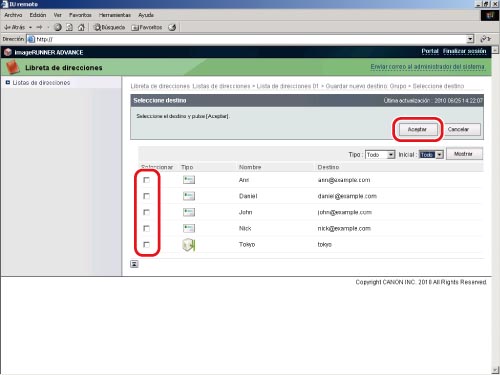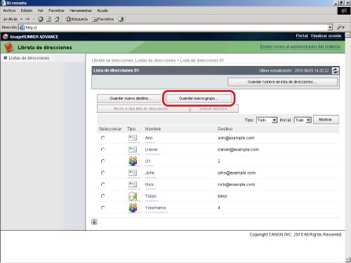 Acceda a la IU remota → haga clic en [Libreta de direcciones] → y seleccione la lista de direcciones de la lista.