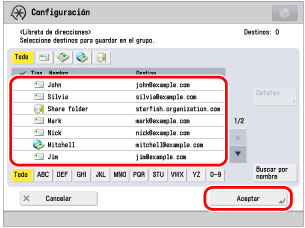 Pulse [Agregar de libreta de direcciones] → seleccione las direcciones de e-mail que desea guardar en el grupo → pulse [Aceptar].