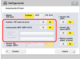 Si el servidor de envío requiere autenticación, haga clic en [Opciones de autenticación/cifrado] → marque el sistema de autenticación.