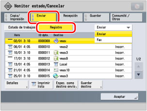 → [Enviar] → [Registro] → compruebe que el trabajo se envió correctamente.