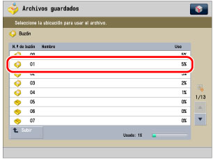 En la pantalla Menú principal, pulse [Archivos guardados] → [Buzón] → seleccione el número de buzón en el que está guardado el documento.