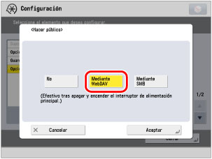 → [Opciones de funciones] → [Guardar/Acceder a archivos] → [Opciones de espacio avanzado] → [Hacer público].