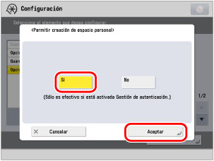 → [Opciones de funciones] → [Guardar/Acceder a archivos] → [Opciones de espacio avanzado] → [Permitir creación de espacio personal].