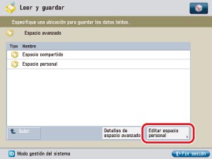 Pulse [Leer y guardar] o [Archivos guardados] en la pantalla Menú principal → pulse [Espacio avanzado].