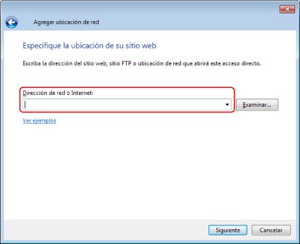 En Windows Vista/Windows 7, haga clic en [Equipo] → con el botón derecho, haga clic en una zona vacía de la carpeta mostrada → haga clic en [Agregar una ubicación de red] → [Siguiente] → [Siguiente] → escriba la ruta siguiente en <Dirección de red o Internet:> (distingue entre mayúsculas y minúsculas).