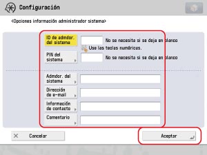 Seleccione [Establecer ID y PIN] → introduzca un máximo de siete dígitos en [ID de administrador del sistema] → seleccione [Cambiar PIN] → introduzca un máximo de siete dígitos para [PIN del sistema] y [Confirmar]. El ID del administrador del sistema y el PIN del sistema son necesarios al iniciar sesión en Configuración.