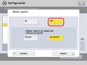 Seleccione [Permitir] o [No permitir] para <Obtener registro de trabajos con software de gestión> → pulse [Aceptar].