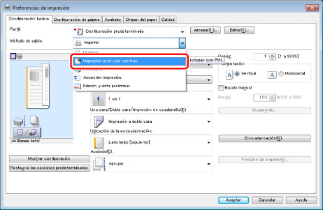 Seleccione [Impresión prot. con contras.] en [Método de salida].
