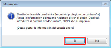Haga clic en [Sí] en el cuadro de diálogo para establecer la información de usuario para el modo de Impresión segura.