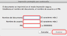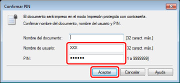 Introduzca el nombre del documento, el nombre de usuario, y el PIN en el cuadro de diálogo [Impresión protegida por contraseña] → haga clic en [Aceptar].