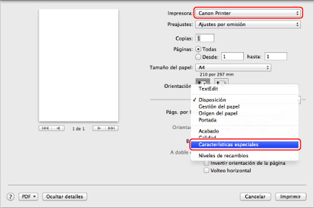 Seleccione la impresora que desea utilizar → haga clic en [Características especiales].